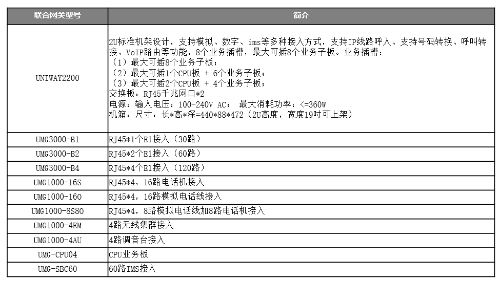 UNIWAY2300联合网关采用刀片式服务器架构,每块单板类似于一个独立的服务器,所有业务单板之间通过交换板进行通信,设备融合 SS7、R2、PRI、AT0等多种通信协议,可通过数字或模拟中继与PSTN或者专网互联,并能够与现网不同时期建设的 PBX 完成接入。UNIWAY2300产品采用模块化设计,安装简单,单板支持热插拔,单机支持双主控。基于可维护、可管理、可运营的设计理念,它具备电信级、高密度、大容量等特点,集IP语音、IP传真等增强型功能于一体,为用户提供构造灵活高效的面向未来的通信网络。