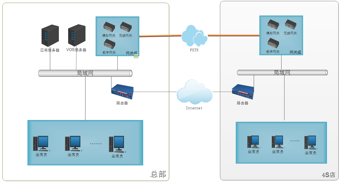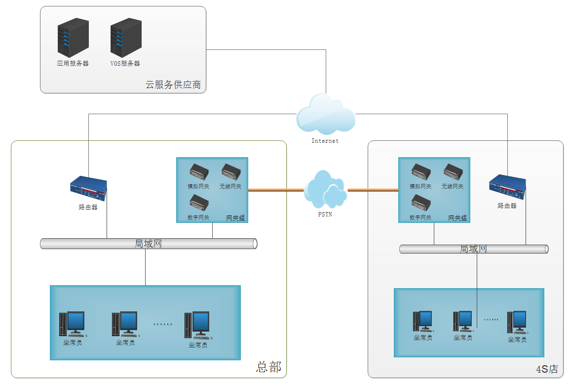 在公司总部和分部部署网关组,通过互联网连接到云VOS服务器,作为公司语音系统核心及呼叫中心系统;